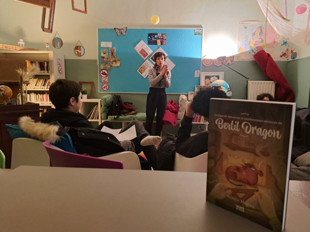 Dans le cadre du cours de français et du prix première Victor, la comédienne Cachou Kirsch lit aux élèves de 3TQe le roman La légende fabuleuse et extrêmement sérieuse de Bertil Dragon d’Amélie Magnin. Cette lecture serait faite en 10 séances.
